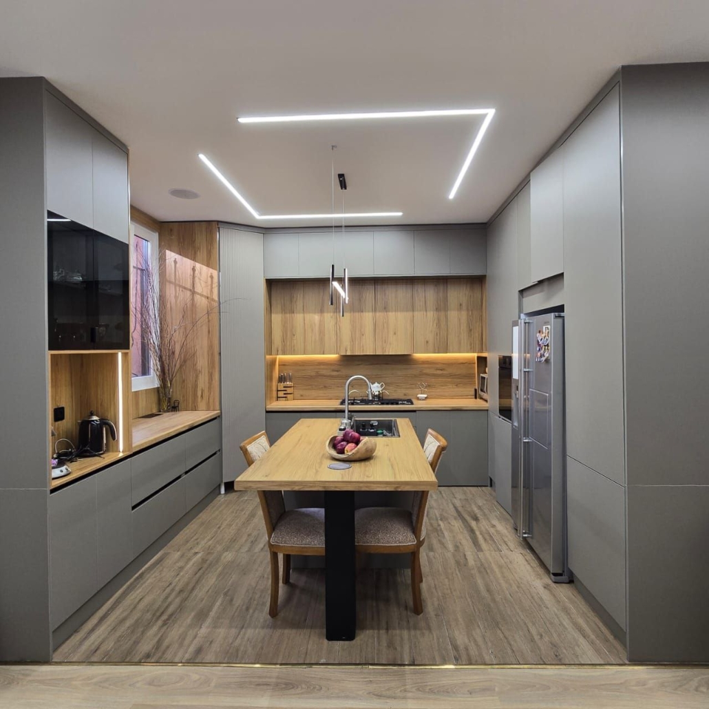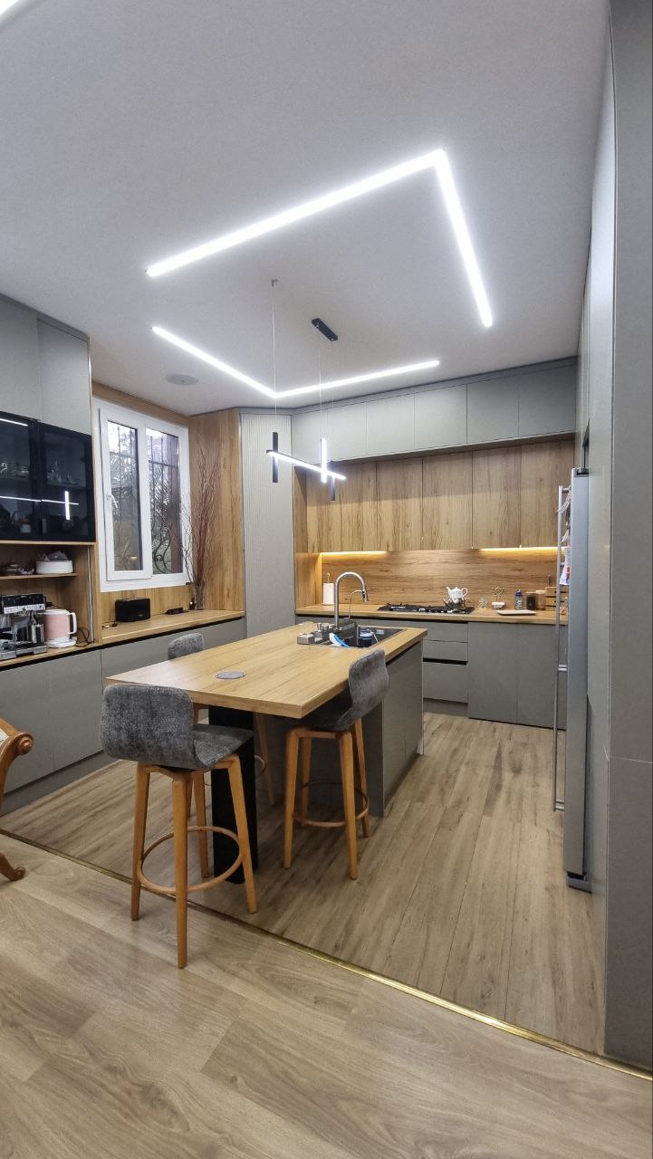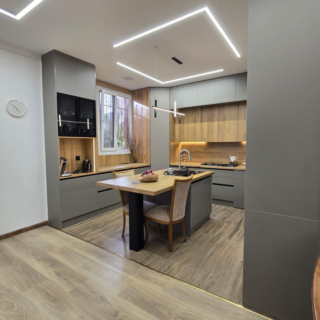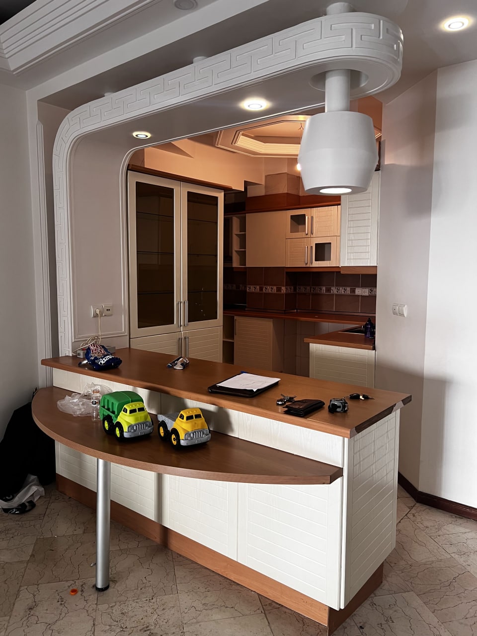 در بازسازی خانه مسکونی در قلهک، آشپزخانه مدل قدیمی بود و سقف آشپزخانه آرک های منحنی داشت که باعث شده بود ارتفاع سقف پایین اومده و فضای بسته ای را در خانه القا میکرد. ما درین پروژه سقف آشپزخانه رو با سالن همسطح کردیم و کلیه کابینت ها هم تعویض کردیم و پلان آشپزخانه رو مجددا طراحی و اجرا کردیم. کابینت ها همگی ام دی اف فرامید بوده و با توجه به فضای کم آشپزخانه، کابینت ها تا سقف ساخته شده است.